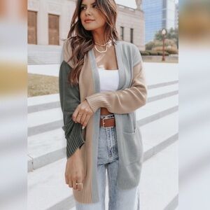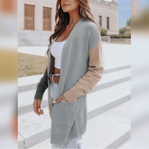 Soft gray and tan cardigan is so comfy yet chic with the color blocking.