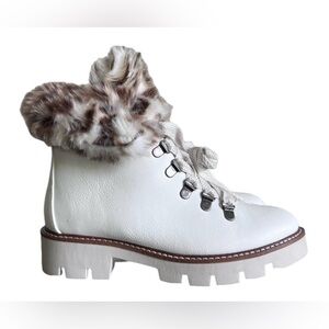 These stylish boots feature white faux leather uppers that are pre-treated with 3M Scotchgard making them water resistant to keep you dry, plush rollover cheetah shearling fur ankle collar to keep you warm, round toe, fabric lining, lightly padded footbed, classic lace-up closure and lugged rubber outer-sole that provides comfort and durability.
