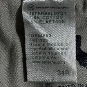 Excellent condition, soft, 97.5% cotton 2.5% elastane, stone khaki color, flat front, zipper fly, metal button closure, leather AG tag above rear welt pocket (pictured), 8.5" inseam, 34" waist (actual measurements pictured)