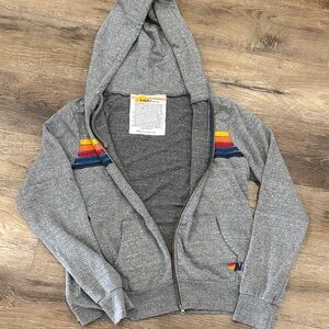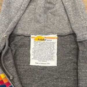 Gray zip-up hoodie featuring colorful stripes in red, yellow, and blue across the chest. Bought this for my daughter, partial tag still in tact, never worn. #aviatornation