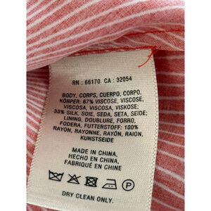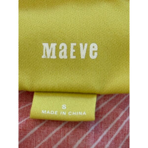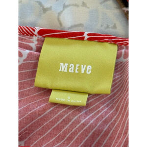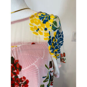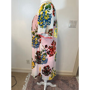 Maeve mini dress in size S features a vibrant multi-color floral print on a pink and white background. The body is a blend of 67% viscose and 33% silk, with a 100% rayon lining. It has short sleeves and a relaxed fit. The dress measures approximately 35 inches in length and 20 inches across the chest. Visible care instructions indicate "Dry Clean Only." The garment is in excellent condition with no obvious imperfections.