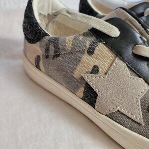 Vintage Havana / VH Design, Est. 1954. Sneakers/flats. Camo Multi, the model is "Gail". Lace-up shoes. Have black rhinestones on top/back.