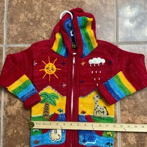 Vibrant children's knit sweater featuring playful designs like a sun, giraffe, and rainbow. Perfect for adding a splash of color to any outfit.