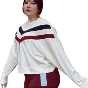 Brand new Antonio Melani sporty sweatshirt in a cream color with contrasting chevron stripe detail across the chest and sleeves. Crew neckline with ribbed collar, cuffs, and hem. Relaxed, sporty silhouette suitable for casual and athleisure wear.