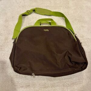 Stylish women's bag featuring a brown base with green floral accents. Perfect for everyday use. Lots of storage pockets. Able to place over roller bag handle for easy transport. Good preowned condition.