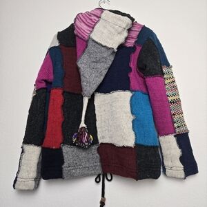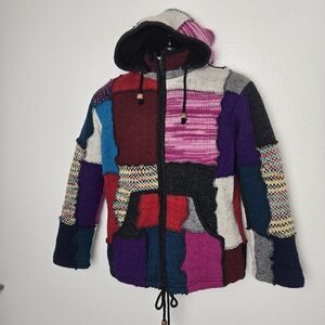 SHOPOHOLIC FASHION Hoodie Jacket Mens Small Knitted Multicoloured Wool Patch