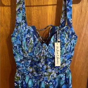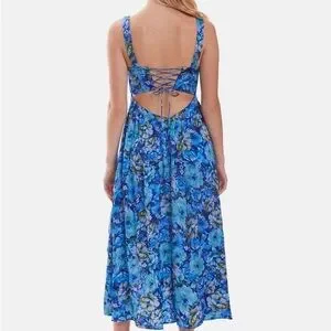 Embrace elegance with this stunning floral blue midi dress. Perfect for any occasion, it features a flattering silhouette and a stylish slit for added flair.