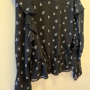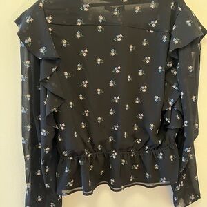 Chic navy blouse with delicate floral pattern. Features ruffle details and a flattering fit. Ideal for versatile styling.