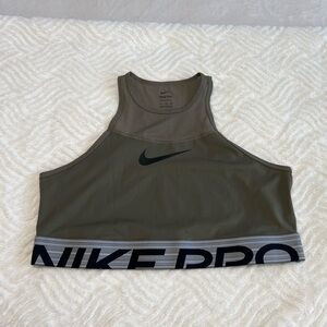 High-performance Nike Pro cropped training tank in olive green with a black Swoosh logo and signature NIKE PRO elastic hem band. Made with Dri-FIT technology to keep you cool and dry through workouts. Flattering racerback cut for unrestricted movement—perfect for gym sessions, weight training, or athleisure wear.