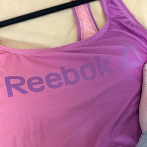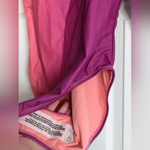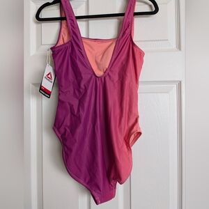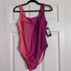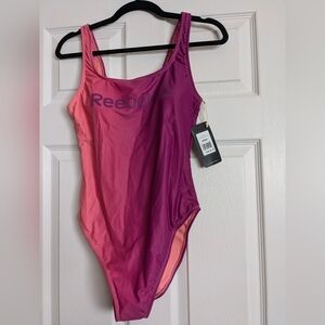 New with tags and protective lining attached Reebook one piece athletic swim suit in pink and purple ombre color. Very flattering and comfortable one piece swimsuit.