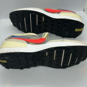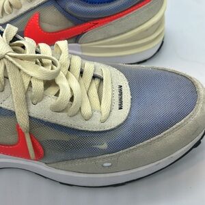 Nike sneakers with a stylish blue and cream design. Features bold red accents. Ideal for casual wear.