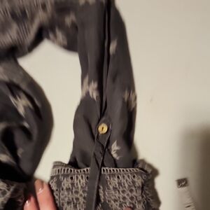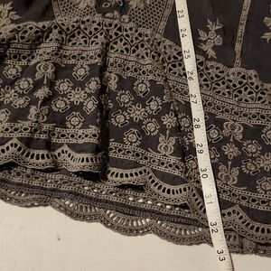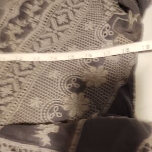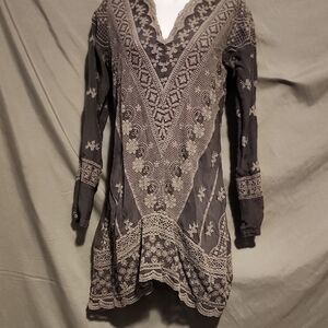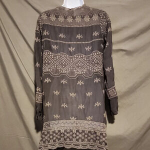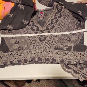 Stylish gray tunic with intricate embroidery by Johnny Was. Perfect for any occasion. Sleeves have option to roll up half way.