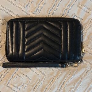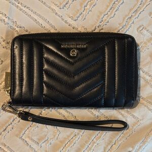 Black Michael Kors wristlet with chevron, quilted pattern. Features a wrist strap and gold-tone logo. All zippers and pockets work properly, gently used, no noticeable defects, smoke-free home.