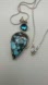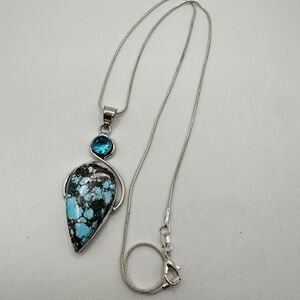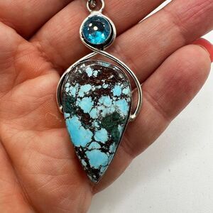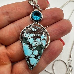 The pendant by itself is marked 925 on the bale. It's about 2.5" long, with a 35x21mm turquoise cabochon (pear shaped) and a 7mm swiss blue topaz.