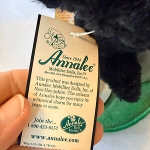 Adorable Annalee plush bear with a toy trash can. Features black fur and a cute face. Includes a green base. Please look at the picture so the condition details. A little bit dusty and a little discoloration and the tissue paper that's in the trashcan. This is about 7 inches tall.