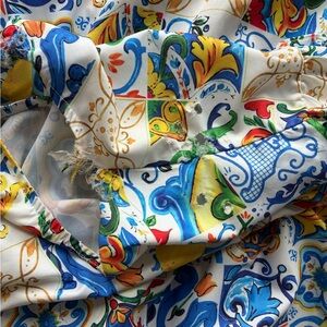 Vibrant dress with a colorful pattern. Features blue, yellow, and green designs. Never worn , haves small holes that’s shown in the picture. It says size small but I think it can also fit for Med.