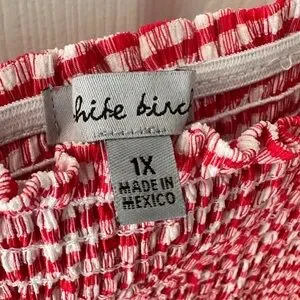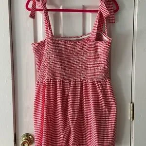 Charming red gingham tank top. Features smocked bodice and tie straps. Perfect for casual outings.
