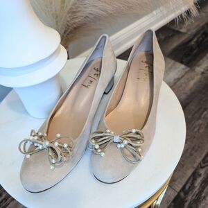 These elegant cream flats from French Sole feature a sophisticated design with decorative pearl embellishments on the toe. Crafted from soft material, they offer a classic rounded toe silhouette and a low heel for all-day comfort. Perfect for both casual and business casual settings, these shoes are a versatile addition to any wardrobe. excellent pre-loved condition. they do have permanent marker on the bottoms.