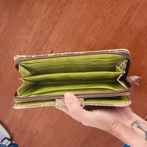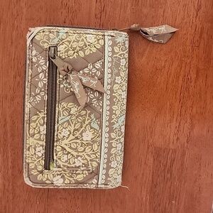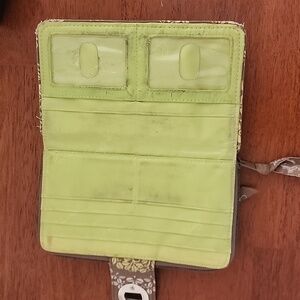 Vera Bradley clutch, pretty green colors, one zip pocket on backside, front opens into a billfold with card, ID and money holder - this section has some slight stains but may come out (I have not tried to wash it). large center zip pocket with more cord holders/slip pockets