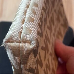 Authentic Michael Kors wristlet known for its classic MK logo canvas and versatile design. This compact shoulder bag is perfect for everyday essentials, errands, or casual outings. Neutral beige and tan tones pair easily with any outfit.