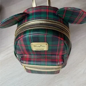 Classic Loungefly Disney Ears backpack. Never used, perfect gift. Green and red plaid with gold straps and trim.