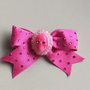 The pics show how cute layering her hair accessories looks. This skull hair bow corsage looks great layered with the flower bobby-pin I have for sale! So Pretty Fun Cool Iconic.