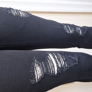 Stylish and edgy, these black distressed jeans are perfect for a casual day out. Pair them with your favorite top for a chic look. Waist 32, Rise 9, hips 38-40, Inseam 25.