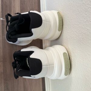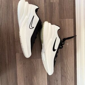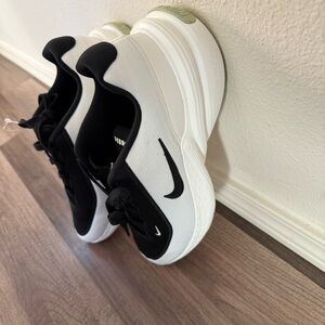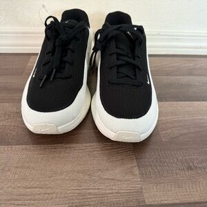 Stylish Nike athletic shoes. Black upper with white accents. Ideal for sports and casual wear.