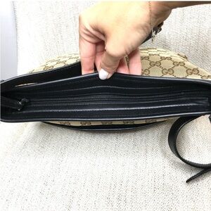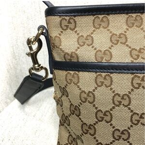 Monogram canvas with signature red & green ribbon accents. Black leather trims.