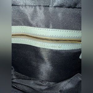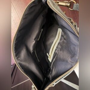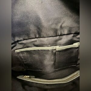 Can be worn with or without the straps. Shoulder strap is adjustable. Bag folds over. Very clean. Brass buckles, studs, zippers. Excellent condition. Width 16”. Height 15”. Bag folded over is 11”. Buckle to top of strap is 21”
