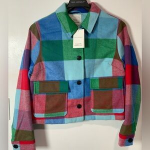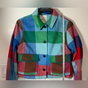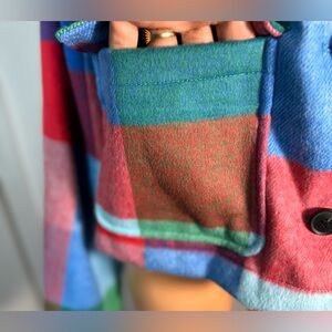 Vibrant plaid jacket featuring a mix of blue, red, and green. Perfect for adding a pop of color to your wardrobe.