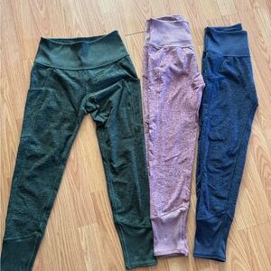 Soft and stretchy leggings by Kirkland Signature. Available in green, purple, and blue. Perfect for everyday comfort. They are all 3 the same leggings just different colors. These leggings have cell phone pockets and detailing on the hips and ankle to match. Selling as a bundle, but feel free to make an offer for a single pair.