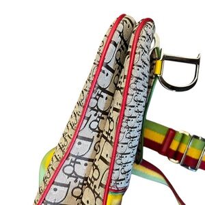 Stylish Dior crossbody bag with iconic pattern. Features vibrant yellow panel and multicolor strap.