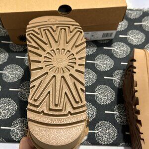 Upper is made of a combination of suede and woven fabric; the lining is filled with plush material.