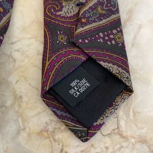 Absolutely gorgeous power tie from Yves Saint Laurent in 100% silk. Features an elegant and timeless paisley print in rich tones that include burgundy/purple, grey, green… stunning piece!