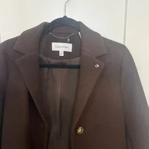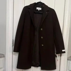 Calvin Klein single breasted overcoat in rich chocolate brown. Features a sleek design with 3 button closure. Extra button included. Brand new with tags.