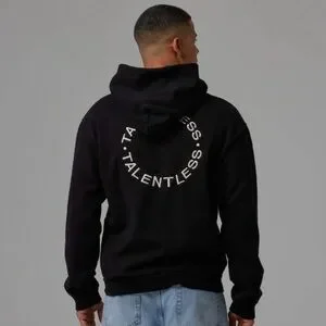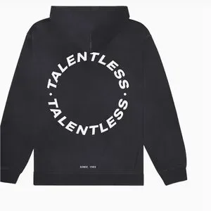 Experience ultimate comfort and style with the Talentless black sweatshirt. This classic pullover hoodie features a sleek design with ribbed cuffs and hem, perfect for any casual occasion. The bold 'TALENTLESS' print adds a touch of modern flair to this timeless piece.