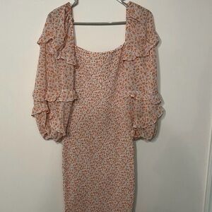 Petal + Pup Floral Smocked Midi Dress Square Neck Ruffle Sleeve Pink Orange