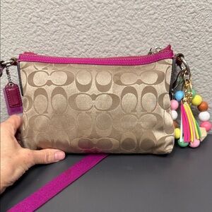 Chic Coach crossbody with fuchsia accents. Signature tan pattern. Ideal for daily wear.