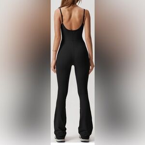 Black Women's Bodycon Flare Jumpsuit with Spaghetti Straps and Scoop neck.