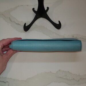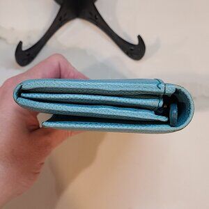 This lady is a lovely Dolce & Gabbana blue Dauphine leather continental flap wallet. This is a ladies wallet. She is in great shape. The leather has been cleaned and conditioned by me, in my leatherworking spa. All her hardware works well and she is clean.