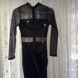 This stunning black dress features a sheer design with sparkling accents, perfect for any special occasion. Its elegant style and eye-catching details make it a must-have addition to your wardrobe. Pictures do not do the sparkles justice!