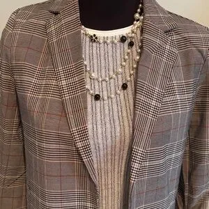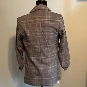 Sophisticated plaid blazer with rolled sleeves. Ideal for professional and casual settings. Anthropology brand, classic blazer with pleated sleeves. Polyester spandex blend