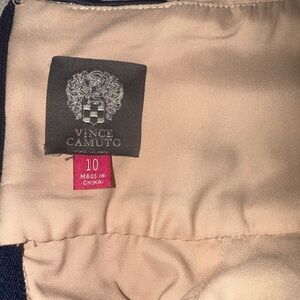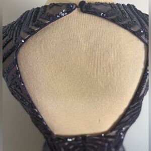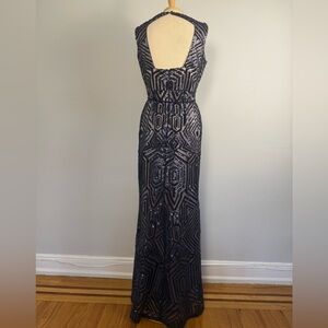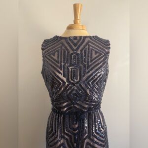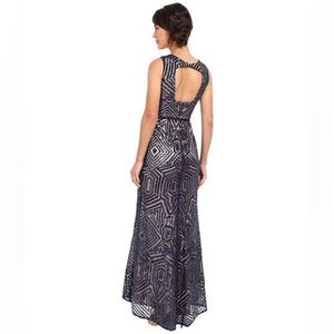 Vince Camuto Gatsby Navy Geometric Sequin Keyhole Back Gown with Fringe Sash