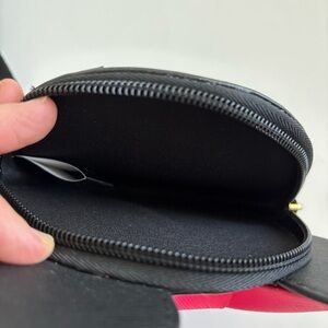 New with tags and the coin pouch still has the plastic tag connecting it to the crossbody. The bag has minor call outs - on the back, the bottom corners appear slightly pushed in, as shown in photos. Also there is a small white mark close to the bottom next to the seam on one side, also shown in a photo. The zippers are both intact and the bag pocket and pouch still have the silica gel packs in them.