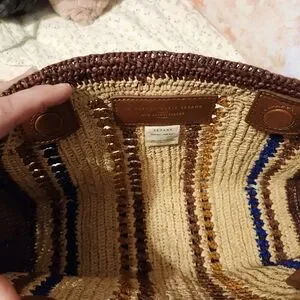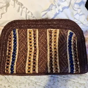 Multi colored in brown, ecru, and blue raffia clutch bag. Magnetic closure on both sides. 12" in length, 7" in width, and 3" deep. I carried this clutch one time. No flaws.