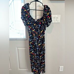 Chic midi dress with vibrant floral pattern. Features stylish puff sleeves