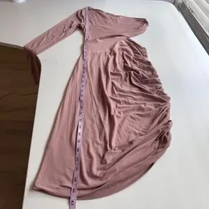 Elegant one shoulder bodycon dress with a single long sleeve. Features asymmetrical neckline and ruched side detailing that creates a flattering draped silhouette. Soft stretchy fabric that hugs the body comfortably.