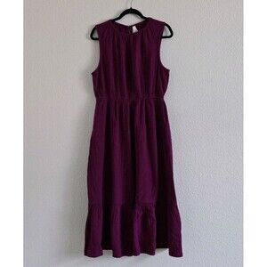 The Pact 100% Organic Cotton Coastal Double Gauze Lavender Midi Dress in Size XL is a stylish and comfortable option for women. Made from lightweight microfiber fabric, this dress features a sleeveless design with a round neckline and button closure. The dress is perfect for various occasions, including travel, weddings, parties, and casual wear. Its boho and beachy theme, along with the addition of pockets, makes it a versatile choice for the summer, fall, and spring seasons. Made by the brand Pact, this dress exudes a cottagey feel with a tiered A-Line silhouette.