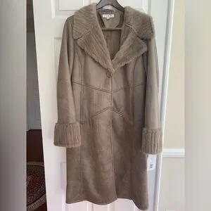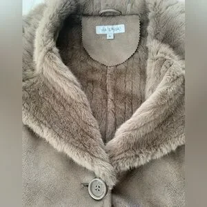Gorgeous Via Spiga Faux Fur Coat: Dark Taupe, Fur Collar and Lining, Side Pockets, 1 Button & Snaps Closure. Fabric: 100% Polyester. Size XL. Extra button enclosed.